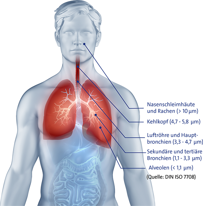 - Krebsrisiko bei Langzeitbelastung: Inhalation von bestimmten Stoffen im Feinstaub (< 1,0 µm) gilt als krebserregend (siehe DIN ISO 7708)