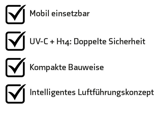 The device is equipped with lockable industrial castors and is made of powder-coated sheet steel. The HEPA-H14 filter cassette and the UV-C light can be conveniently removed via maintenance doors. The UV-C section can be deactivated manually via a switch.