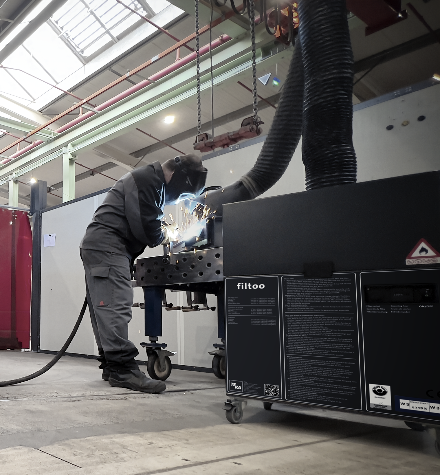 Para industria y talleres: sistemas de extracción certificados — móviles o centrales. Certificación W3 para humos de soldadura; sistemas conformes para humos de láser, polvo de esmerilado y humos de soldadura blanda.