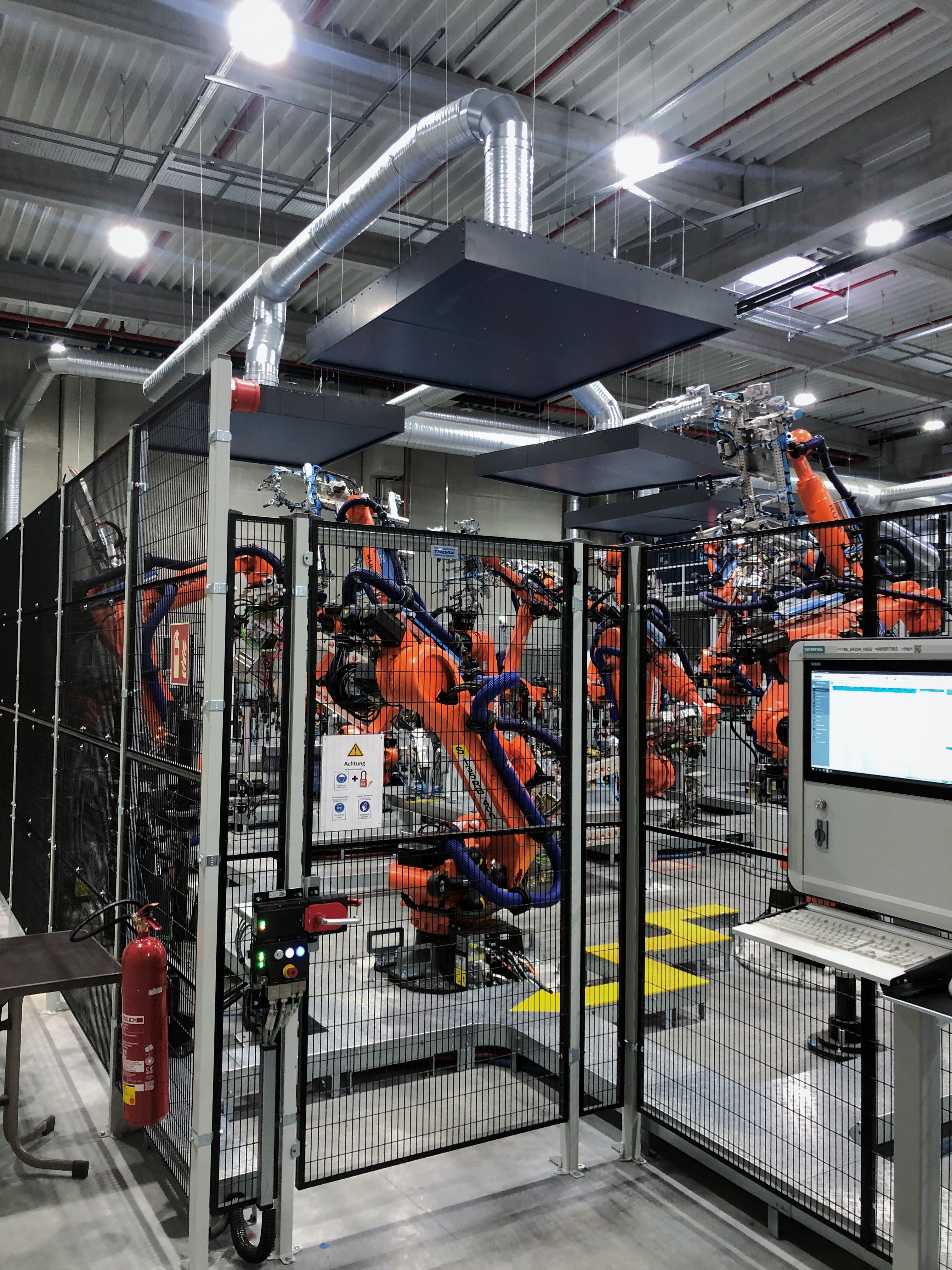 Titulo (7354): En la producción de hasta 1.000 piezas al día, 11 capós de aspiración de 2,5 m x 2 m o 3 m x 4 m garantizan un aire ambiente sano durante la soldadura robotizada.